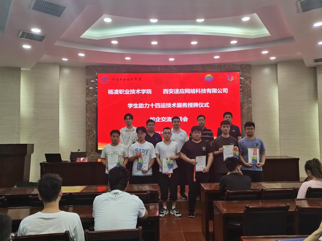 我院学生黎愿等多名同学在十四运期间服务于杨凌网球中心及水运中心两个场馆的网络运维保障工作。工作期间服从安排,技术过硬,获得组委会与西安速应网络科技有限公司的一致认可。西安速应科技有限公司受十四运组委会委托,向以上同学颁发荣誉证书。
